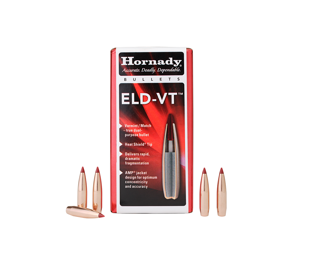 Product Features HEAT SHIELD TECHNOLOGY ELD-VT bullets incorporate the Heat Shield tip, which resists the effects of aerodynamic heating. They retain their shape to maintain the lowest drag over their entire trajectory. ADVANCED MANUFACTURING PROCESS (AMP) BULLET JACKETS A testament to an unwavering commitment to excellence, AMP bullet jackets provide unrivaled consistency in concentricity and thickness, ensuring every ELD-VT bullet performs at its peak. RAPID FRAGMENTATION The Hornady ELD-VT bullet isn't just about hitting the bullseye it's about making a statement when it gets there. Upon impact, the polymer tip drives rearward through the large air gap and into the bullet core, causing rapid and dramatic fragmentation, even at low velocity. PRECISION PERFORMANCE Born from a culmination of years of ballistic research, the ELD-VT pairs the aerodynamics of low drag match bullets with the lighter weight of a varmint bullet, giving the ELD-VT a level of uncompromising dual-purpose performance. Say goodbye to compromise, as this bullet's match-winning accuracy and rapid expansion will set new standards. UNIQUE WEIGHT TO LENGTH DESIGN Long, sleek, match bullet profile with reduced core-to-bullet length ratio maximizes muzzle velocity and moves the center of gravity rearward which enhances aerodynamic performance.