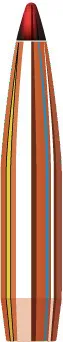 With high velocity 0-400 yard impact, the bullet continually expands throughout its penetration path. The thick shank of the jacket and high InterLockring keep the core and jacket together providing 50-60% weight retention.