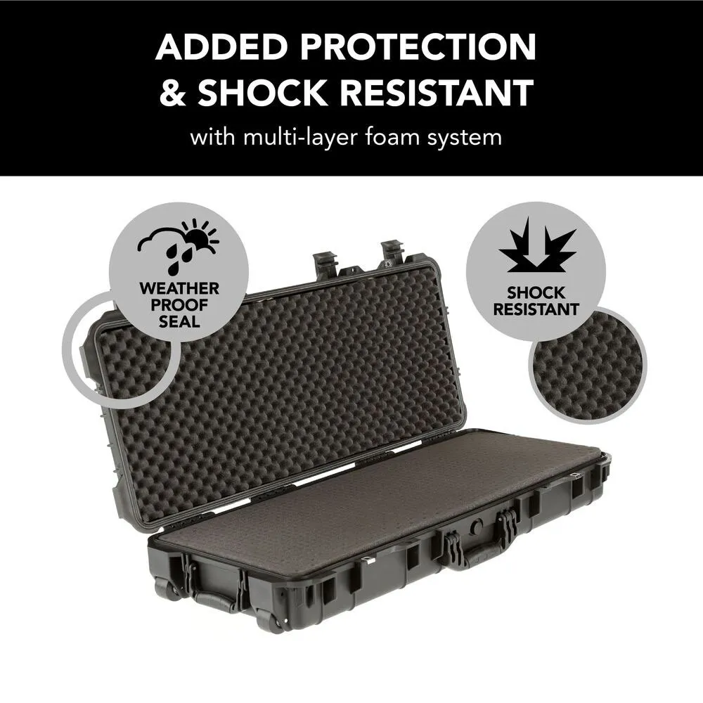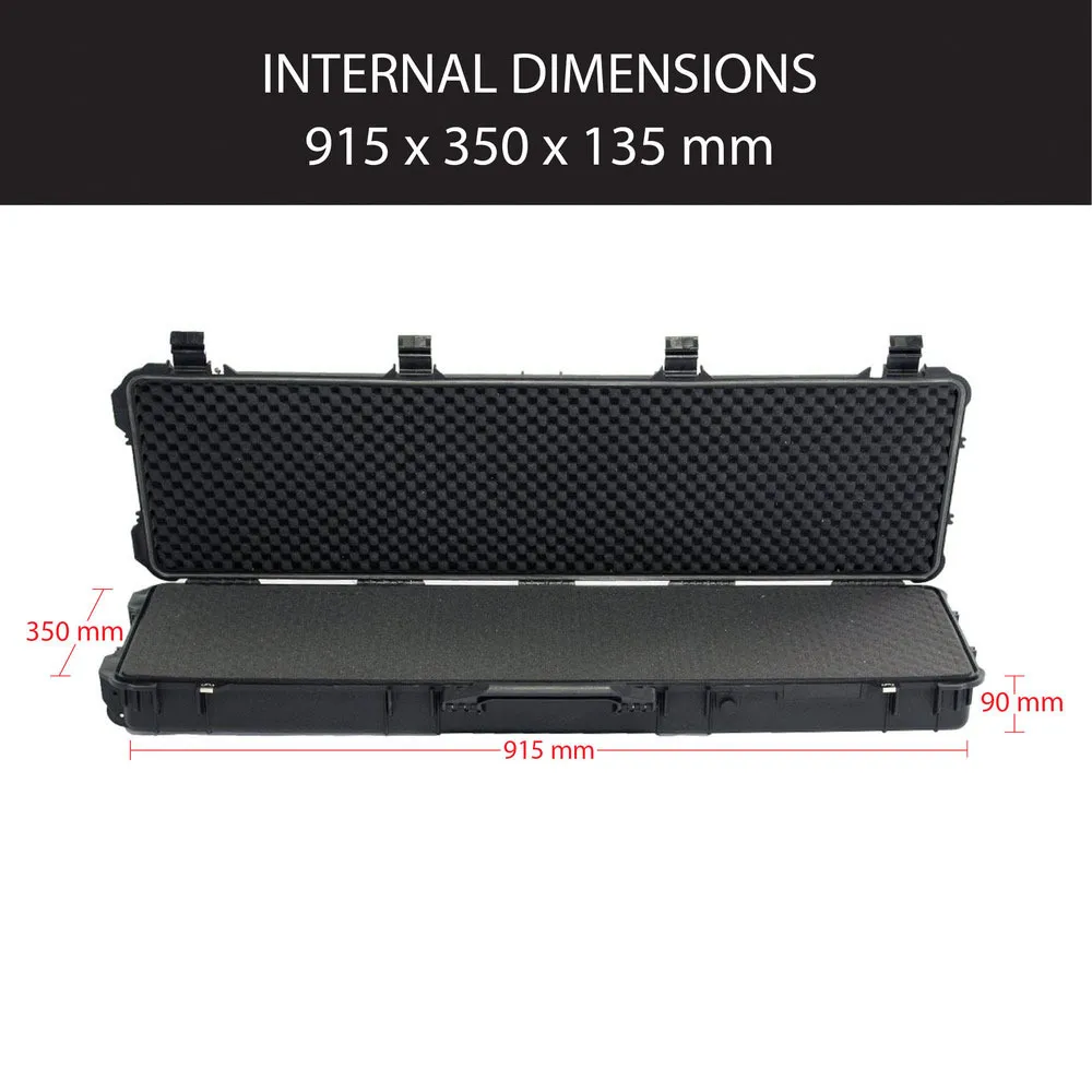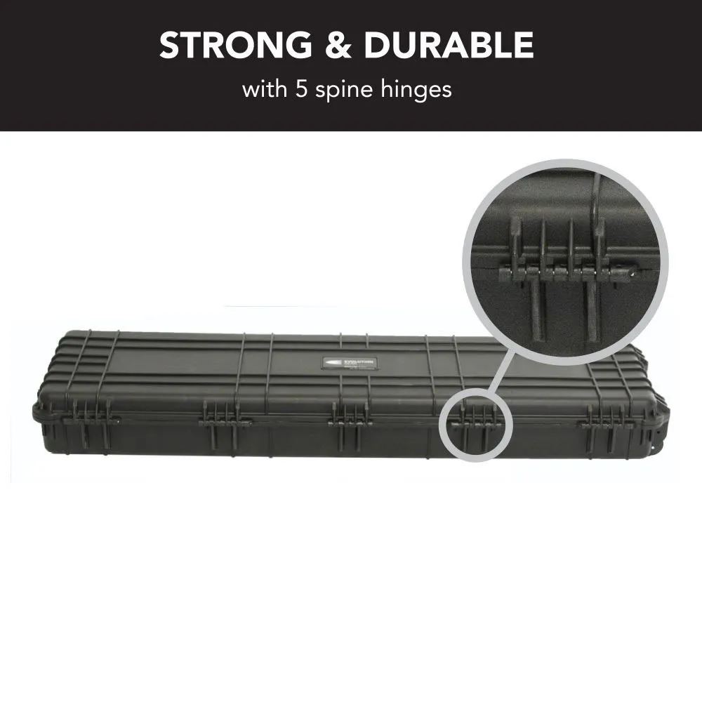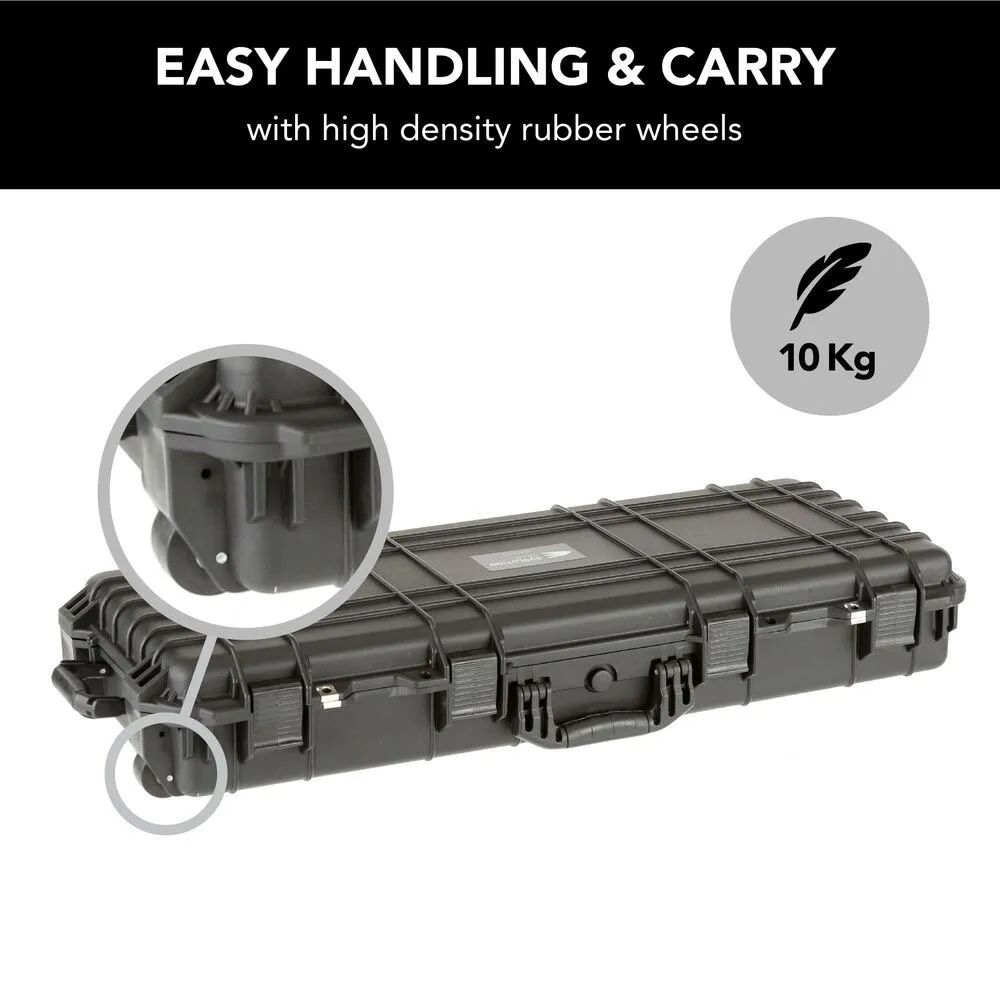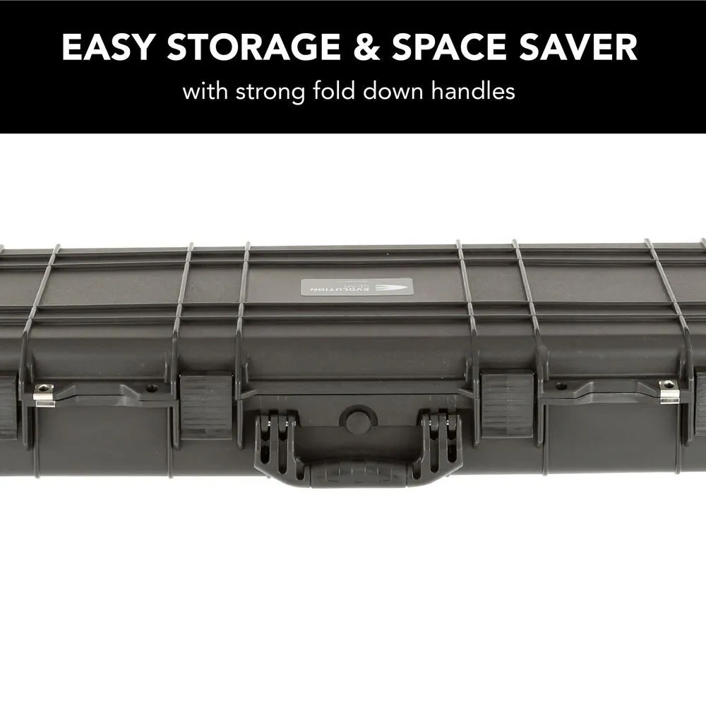 The Evolution Gear HD Series Rifle Hard Gun Case M - Black is your ultimate companion for secure and reliable transportation of firearms and sensitive equipment. Designed with the rugged outdoors in mind, this case is shock resistant and weatherproof, ensuring your gear remains protected in any environment. Whether you're heading to the range or embarking on a hunting expedition, this case offers peace of mind with its robust construction and customizable foam interior. Crafted from high-quality polypropylene, this case meets TSA airline safe requirements, making it ideal for travel. The integrated pressure release valve and reinforced padlock holes provide added security, while the high-density rubber wheels and fold-down handles ensure easy handling and storage. With its sleek black design, the Evolution Gear HD Series Rifle Hard Gun Case M is not only functional but also stylish, making it a must-have for any firearm enthusiast.