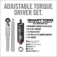 The Smart-Torq Adjustable Limiter & X3 Driver Kit provides precision and versatility for gunsmithing tasks. The Smart-Torq Adjustable Limiter allows for exact torque application, adjustable from 15-65 in-lbs in 1 in-lb increments, ensuring reliable tightening of scope rings, mounts and action screws. Its locking, “click-style” overload clutch delivers consistent performance and prevents over-tightening.